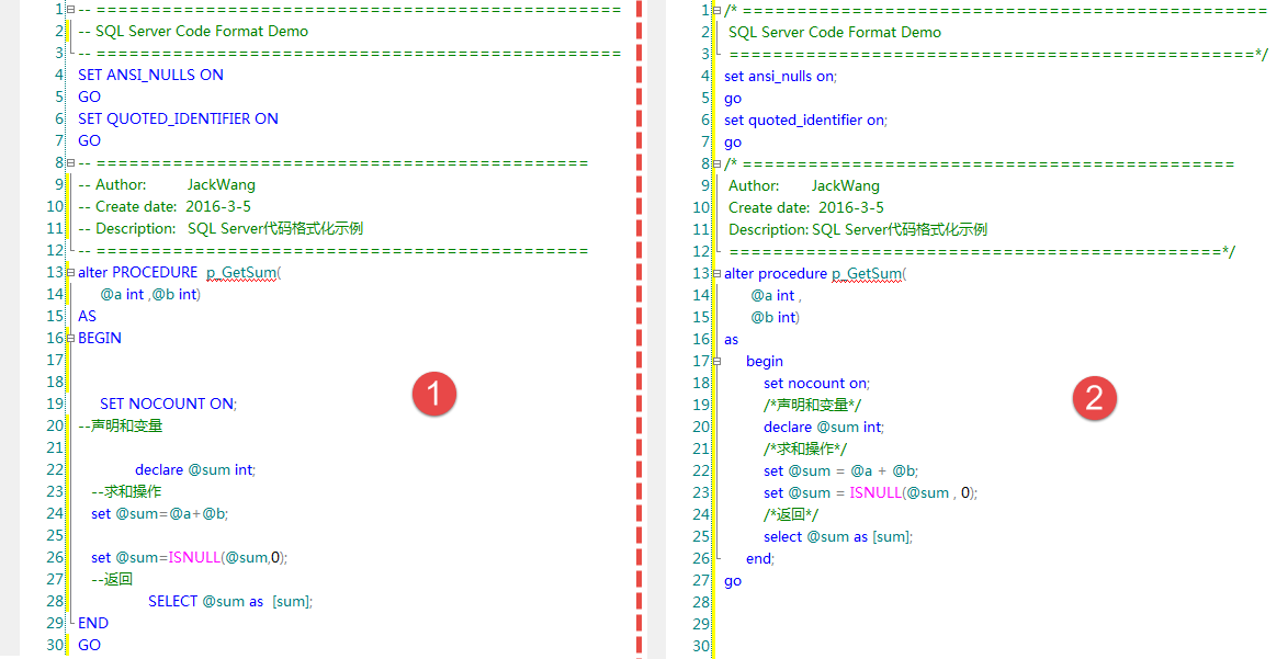 下面举个例子,如下图所示。左边的为未格式化的脚本,右边为格式化后的脚本: