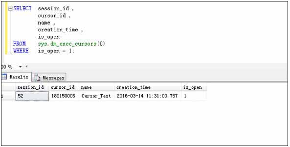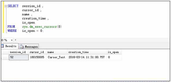 关于该动态管理函数返回的表的各个字段的解释,可以参考MSDN文档。不同数据库版有所区别。如果要查询没有关闭的游标,则需要对字段is_open进行过滤(指定游标是否处于打开状态。1为打开,0表示关闭)