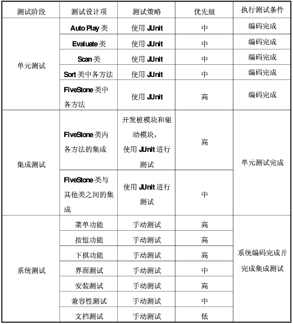 分阶段对应不同测试设计项和测试执行项,在需求阶段主要侧重设计功能测试用例,建立按业务流程和系统功能分类的测试内容。在设计阶段主要侧重设计界面测试用例。在编码或集成阶段侧重执行单元测试和集成测试。五子棋游戏系统测试清单表: