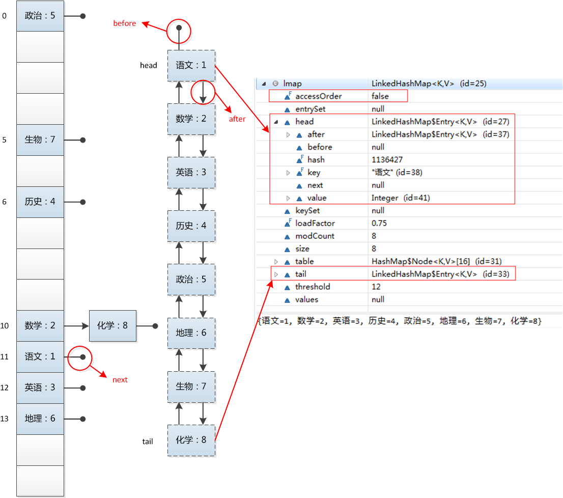 我们可以观察到,和HashMap的运行结果不同,LinkedHashMap的迭代输出的结果保持了插入顺序。是什么样的结构使得LinkedHashMap具有如此特性呢?我们还是一样的看看LinkedHashMap的内部结构,对它有一个感性的认识: