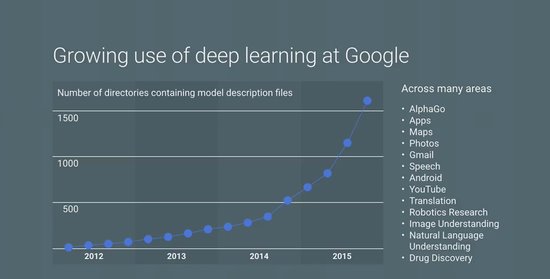 谷歌机器学习负责人杰夫·迪恩(Jeff Dean)随后介绍称,随着近年来机器学习技术的逐渐成熟,谷歌正加快步伐在主要平台部署机器学习技术。除了此前战胜李世石而闻名的围棋程序AlphaGo,更有用户熟知的搜索、Youtube、Android、地图、Gmail等核心产品。