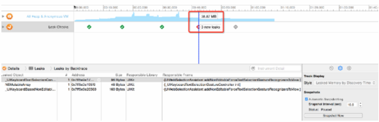 当然,有些并不严重的内存泄露 Instruments 不会用红色标示出来,这时需要通过查看内存的增长情况来判断是否有内存泄露。例如:内存的分配一直在增长,当退出某一个页面时,内存并没有丝毫的释放。这时需要仔细地分析和耐心地排查了。具体的一些更细节的内存排查方法,还需要参考苹果官方文档和一些内存专题的文章学习,以进行更加细节的内存问题定位。
