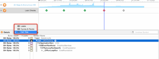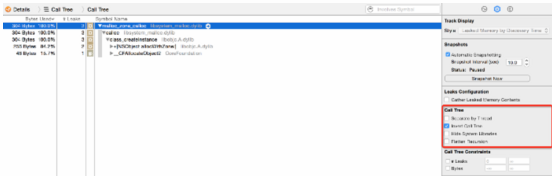 当 Leaks 模板显示红色条状时(如图 5),说明有明显的内存泄露,可通过 Leaks 的 Call Tree 来查看程序的调用树,如图 6 所示。