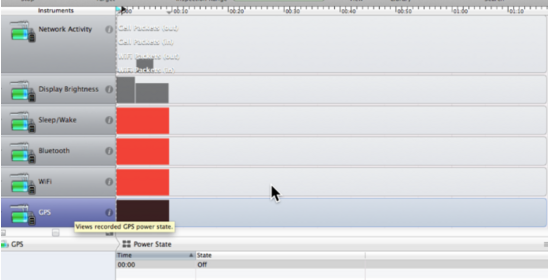 电量测试在专项测试的优先级中,并没有稳定性和兼容性测试高。但是稳定性和兼容性方面业内已经比较成熟了,在各种技术分享和一些技术文章中也有大量的实践讨论。所以,本文不再针对稳定性和兼容性测试进行描述,直接开始电量测试相关的测试总结。iOS 的耗电量都是一些硬件设备造成的,当然硬件的很多不合理和不必要的使用都是通过软件程序来控制的。所以 Instruments 工具的电量分析会帮助你扫描在 iOS 应用使用过程中各种耗电的硬件是打开还是关闭状态。比如,需要格外关心 GPS 的使用、Wi-Fi 和手机网络的使用频度等。如图 8 所示。此时的电量分析只能通过一些硬件的使用开发来定性地进行分析。