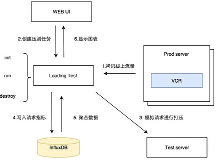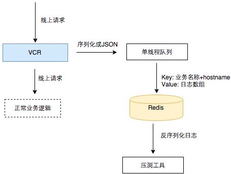 在这里压测工具提供了一个叫VCR(录像机)的工具来拷贝流量。VCR能够将线上的请求序列化后写到Redis里面。