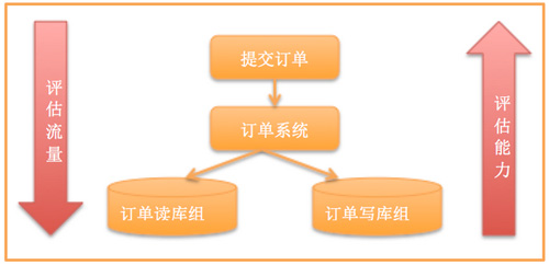 从上到下评估流量,从下至上评估能力:发现一次订单提交有20次数据库访问,读写比例高峰期是1:1,然后跟进数据库的能力倒推系统应该放入的流量,然后做好前端的异步下单,让整个流量平缓地下放到数据库。
