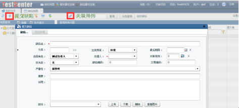 首先我来介绍一下testcenter中已有的基本属性,缺陷名,出现频率,优先级,缺陷基本描述没有什么介绍的,<分类>已经在开发篇讲过了,<选择角色><处理人>是选择下一状态的处理人(是在定制缺陷流程中规定,会在缺陷流程篇讲到的),<关联用例>是把该缺陷与测试用例关联起来,可以在查看缺陷时看到用例详情的(另一种方法呢是直接点击功能栏上的关联用例也是可以的),<后期限>顾名思义好了,根据实际情况选择要不要设置啦,其他的好像也木有什么可以讲的哎,看图吧↓