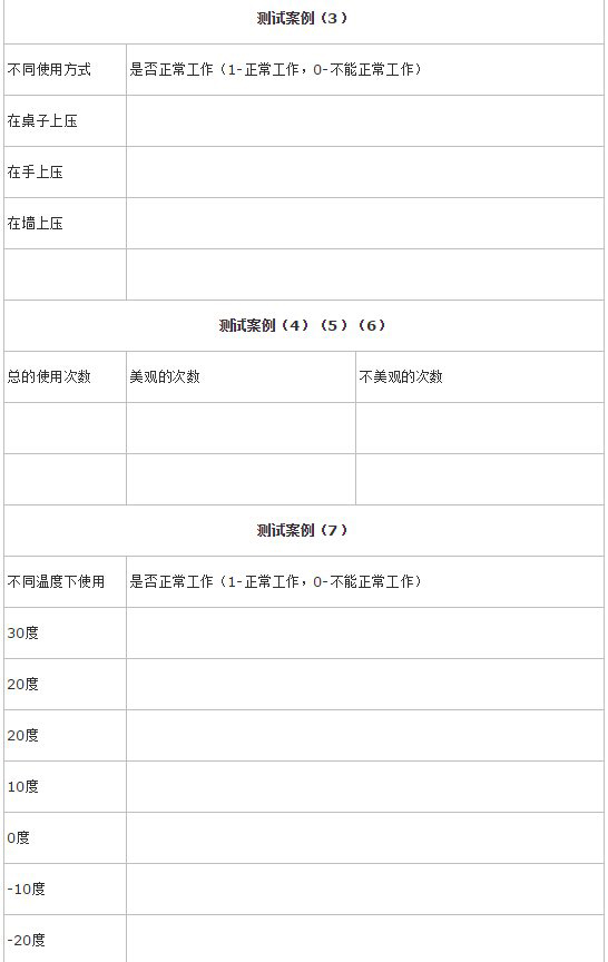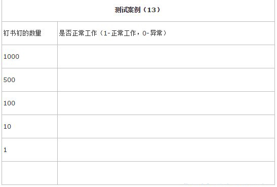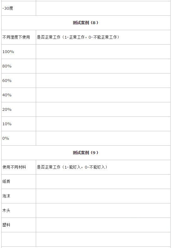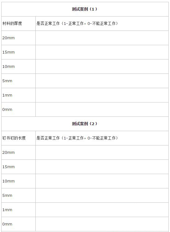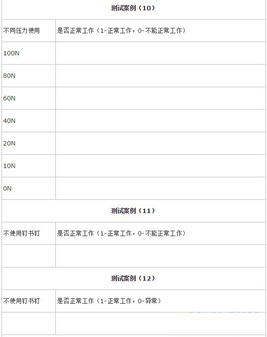 设计10个或者更多的测试案例完成对钉书钉的功能测试