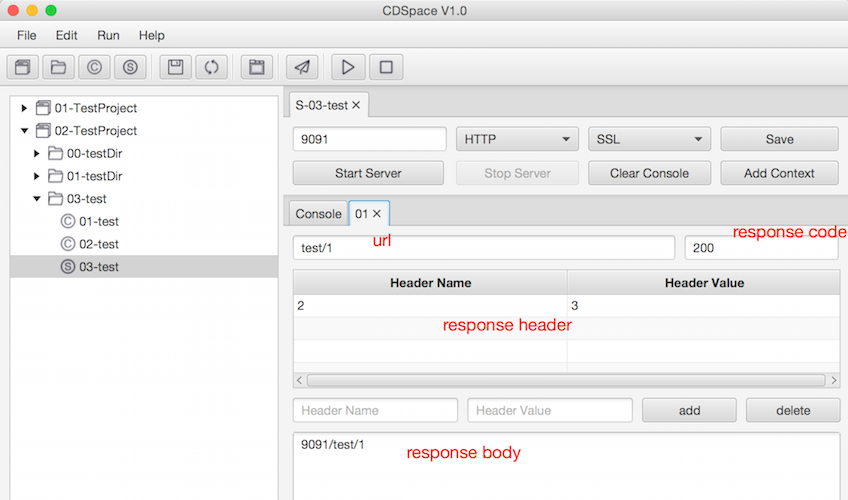 2、Add Context,编辑如下信息:url(test),response code(200)、response body(testbody)、response header(name-value);