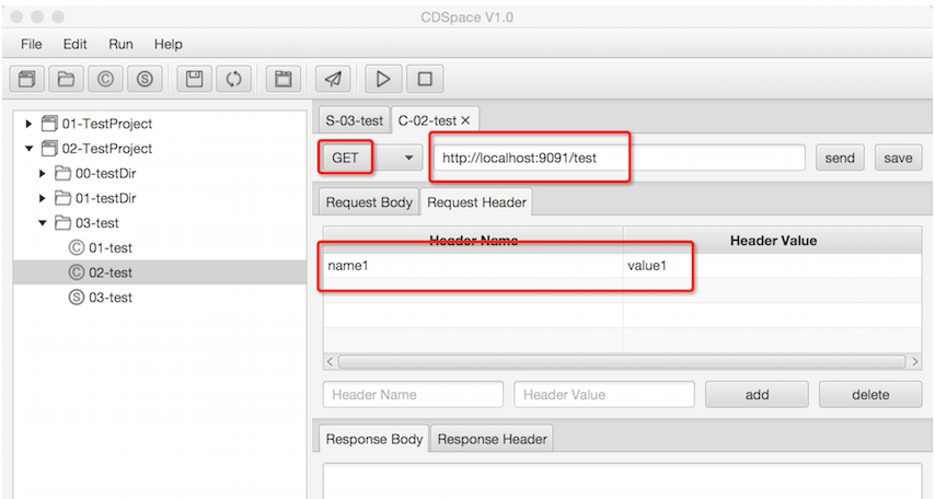 4、新建HttpClient,编辑如下信息:Http Method(Get)、url(http://localhost:9091/test)、Request Body(空)、Request Header(name1-value1),然后点击Send。
