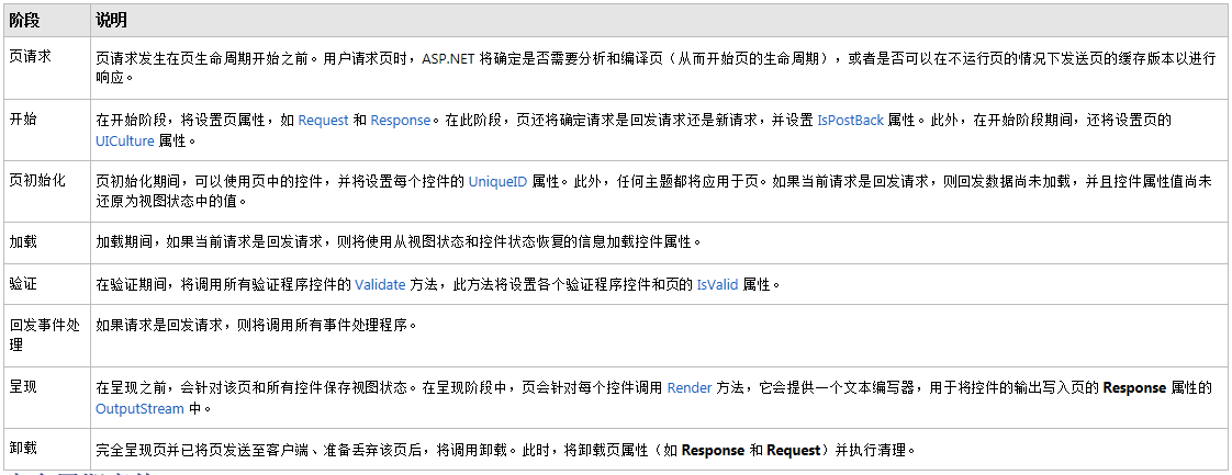 一般来说,页要经历下表概述的各个阶段。除了页生命周期阶段以外,在请求前后还存在应用程序阶段,但是这些阶段并不特定于页。(有关更多信息,请参见 MSDN:ASP.NET 应用程序生命周期概述。)