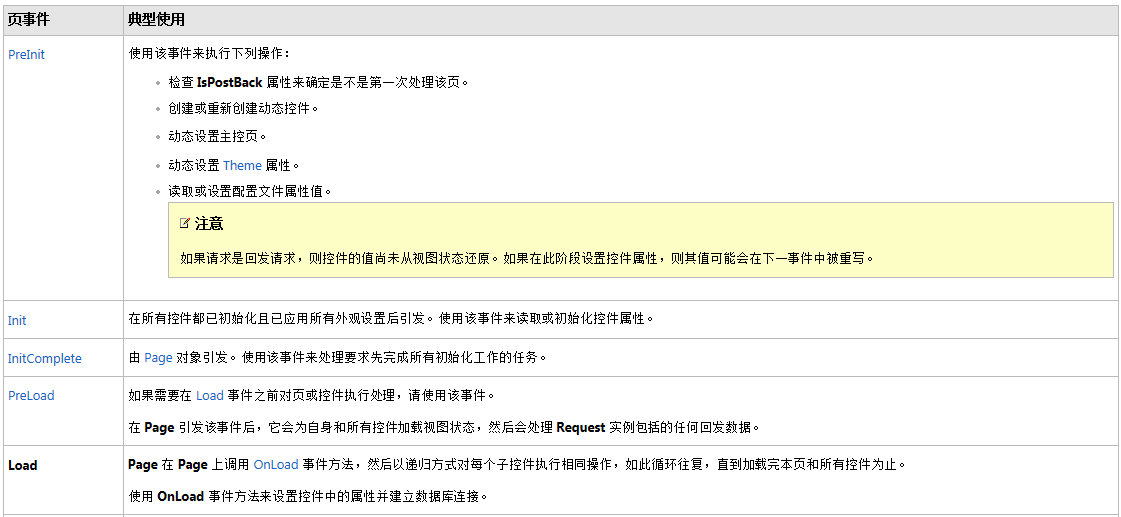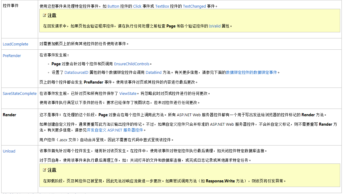 下表列出了常用的页生命周期事件。除了列出的事件外还有其他事件;不过,大多数页处理方案不使用这些事件。而是主要由 ASP.NET 网页上的服务器控件使用,以初始化和呈现它们本身。如果要编写自己的 ASP.NET 服务器控件,则需要详细了解这些阶段。(有关创建自定义控件的信息,请参见MDDN:开发自定义 ASP.NET 服务器控件。 )