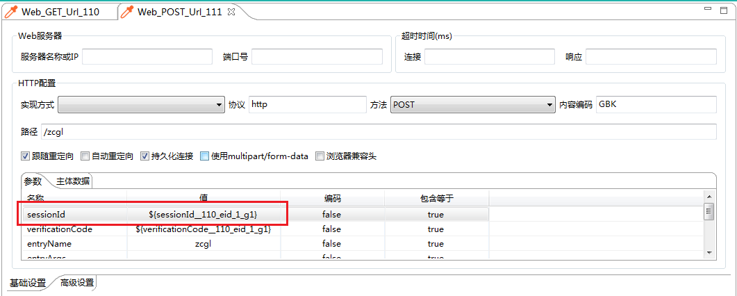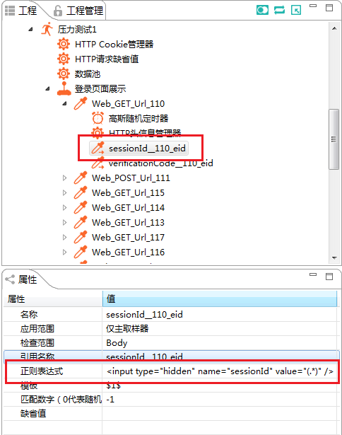 此处正则表达式需要提取sessionId的数值,故在数据产生行,将实际数值替换成(.*),将变量命名为sessionId__110_eid,多一句嘴:名字虽然可以任意起,但是好起一个有意义的名字,方便脚本的查看调试。