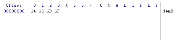 以上代码中,我们使用FileWriter向demo.txt中写入了“demo”这四个字符,我们用十六进制编辑器WinHex查看下demo.txt的内容: