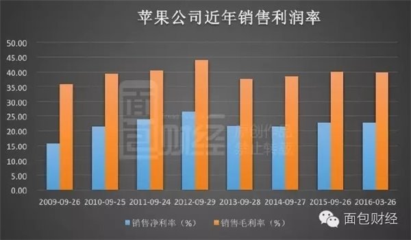 尽管本季财报低于预期,但自2009年以来,苹果的毛利率一直维持在40%左右,净利润率从来没有低于过20%。虽然苹果手机销量只占全球手机的一成多,却拿走了全行业7成以上的净利润。