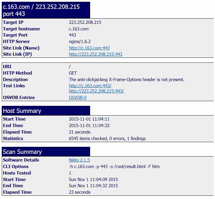 docker run -v /home/root/data/:/root --rm -t kenney/nikto:latest nikto -h c.163.com -p 443 -o /root/result.html -F htm