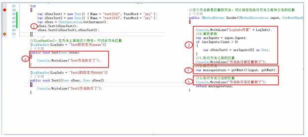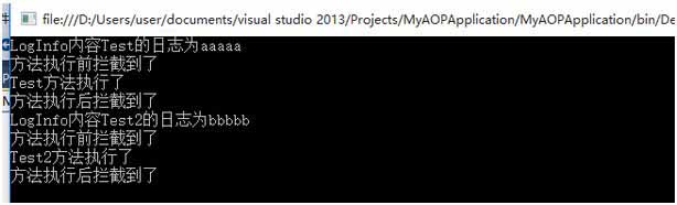 由于Test()和Test2()方法上面加了LogHander特性,这个特性里面定义了AOP的Handler,在执行Test和Test2方法之前和之后都会进入Invoke()方法里面。其实这是AOP的意义所在,将切面的通用功能在统一的地方处理,在主要逻辑里面直接用过特性使用即可。