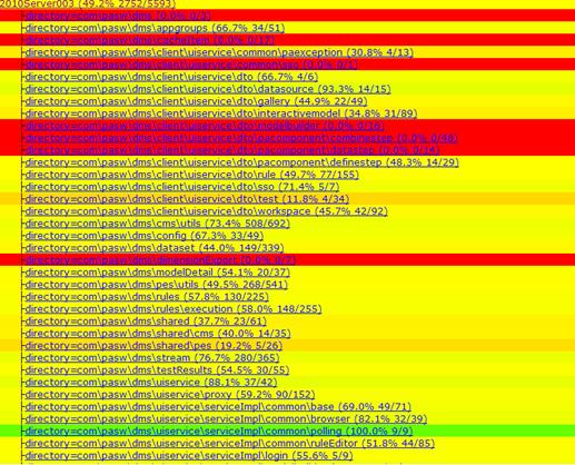 图 9 第一行显示代码覆盖率为 49.2%,显示总共有 5593 个方法需要被测试,其中您的测试用例覆盖到 2752 个方法,两者的相除的结果是代码覆盖率。接着再看红色部分显示的是没有覆盖的代码(覆盖率为 0%),绿色部分显示全部覆盖的代码 ( 覆盖率为 ),黄色部分显示的是只有部分代码被覆盖。
