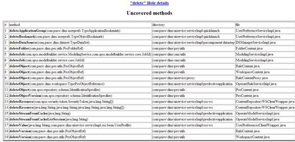 在这个图表中,比如我们看到在目录 compaswdmsuiserviceserviceImplquicklaunch 中的 UserPreferenceServiceImpl.java 源文件,检查到 deleteApplicationGroup (com.pasw.dms.userprefs.TypeApplicationBookmark) 方法没有被覆盖,这个报表非常明确地告诉测试人这个方法没有被测试到,那么我们检查测试用例,是否有对应这个方法的测试用例,接着可以补充这个测试用例以提高代码覆盖率。以此类推检查所有没有被覆盖到的方法,并分析和补充缺失的测试用例。