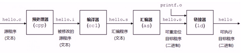 gcc hello.c -o hello 直接编译链接成可执行目标文件