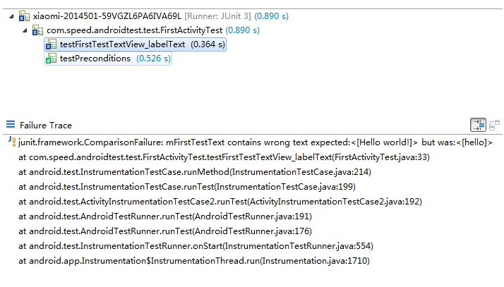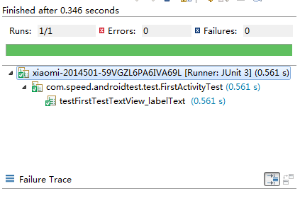 项目工程右键Run as ==>Android JUint Test,安装完成后会自动执行测试用例,testFirstTestTextView_labelText执行判断