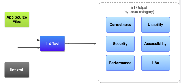 Android Lint提供了命令行执行和IDE(如eclipse)集成两种使用方式,并提供了html形式的输出报告。Lint支持自定义分析策略,在eclipse的preference中可以对lint规则进行全局配置,设置所有项目默认的lint检查规则的检查级别等。此外,还可以通过编辑某个项目的lint.xml文件来灵活实现局部规则配置。其基本工作原理如下图所示。