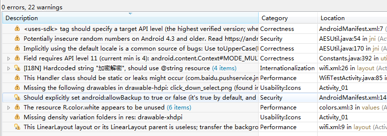 Android Lint是另一种静态代码分析检查工具,专门为Android服务。它通过对Android工程源码进行静态代码分析,发现潜在的缺陷和优化改进项。Android Lint可以在correctness正确性、security安全性、performance性能、usability可用性、accessibility可访问性和internationalization国际化这几个层面分析代码。正如官方网站所说,它是非常强大的,能给开发者大量的建议以提高代码质量。