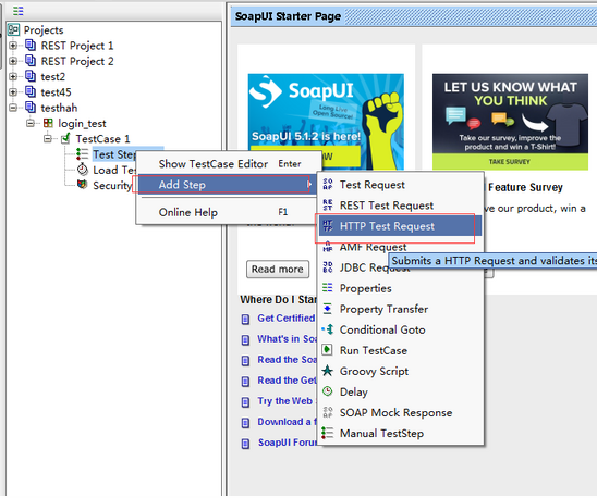 注:此处选择HTTP Test Request,目前我测试的接口是http的,接口有哪些类型可自己百度,或者不清楚所测接口是什么类型可与开发确认