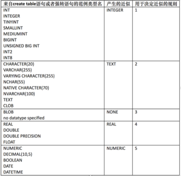 为了使sqlite和其他数据库间的兼容性大化,sqlite支持"类型近似"的观点,列的类型近似指的是存储在列上数据的推荐类型。