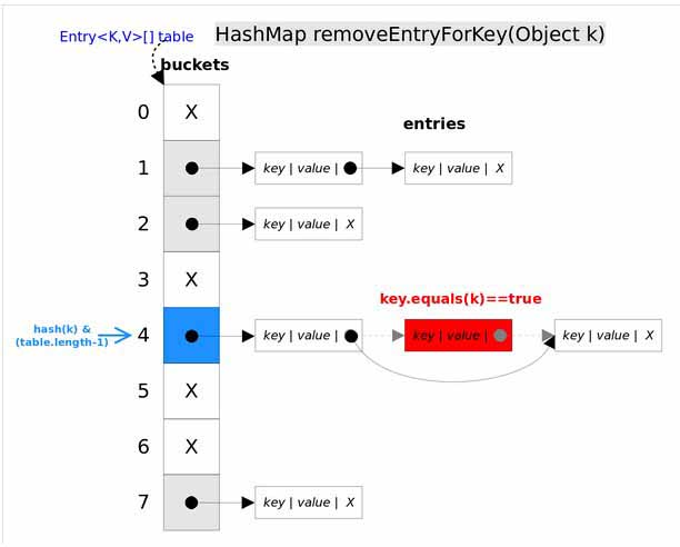 remove(Object key)的作用是删除key值对应的entry,该方法的具体逻辑是在removeEntryForKey(Object key)里实现的。removeEntryForKey()方法会首先找到key值对应的entry,然后删除该entry(修改链表的相应指针)。查找过程跟getEntry()过程类似。
