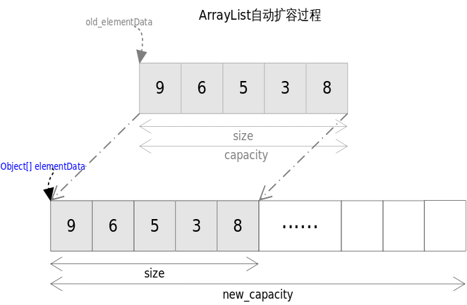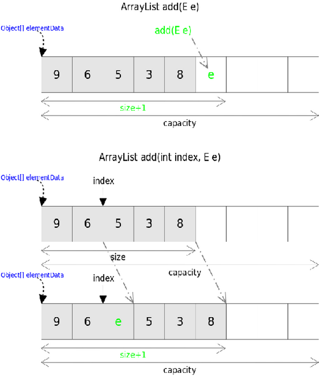跟C++ 的vector不同,ArrayList没有bush_back()方法,对应的方法是add(E e),ArrayList也没有insert()方法,对应的方法是add(int index, E e)。这两个方法都是向容器中添加新元素,这可能会导致capacity不足,因此在添加元素之前,都需要进行剩余空间检查,如果需要则自动扩容。扩容操作终是通过grow()方法完成的。