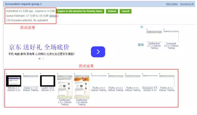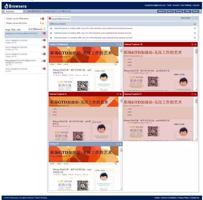 测试过程中会有测试进度提示,结束后你的注册邮箱和Browsera当前窗口都能够看到一份详细的测试结果,包括几款测试浏览器的页面布局差异结果,而且可以滑动查看布局页面图片效果,以便于做出相应的修改。