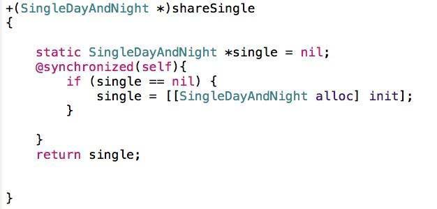 上图1,首先创建一个单例,继承于NSObject, 如图是一个便利构造器方法, 先是创建一个类的静态变量, 并设置为空, 意思是在第一次运行到这里, 把单例对象置空, 之后会跳过这行命令.? 下一行的@synchronized(self)为线程锁, 一般我们看到的ios单列中并未有加@synchronized(self), 然而这样如果是多个线程同时来调用该单列,会出现问题,创建的实例不只是单例了,加了线程锁后让该单列始终只能返回一个实例,即单例:假如线程A来调用shareSingle这个方法时,会判断 single == nil的情况,若没有创建则会创建实例,然而另外的一个线程B也来调用这句话时候,没有线程锁的情况会使其并发调用,即创建了两个实例;有了线程锁,让A创建好了实例后,那么B再来调用的时候不会走进入if(single == nil){}的括号,而直接执行 retrun single这句,避免了重复创建实例。我认为线程锁的作用在于避免并发调用该方法,避免创建大于1个实例。