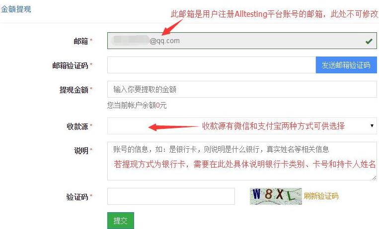 测试工程师每提交一个缺陷被采纳后,即可获得相应的收益,收益在“个人主页”可查询。测试工程师可以对个人收益进行提现,提现可通过支付宝、微信和银行卡三种途径进行。在申请提现时,需要进行邮箱验证操作,验证通过后,方可进行提现操作。