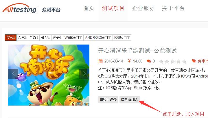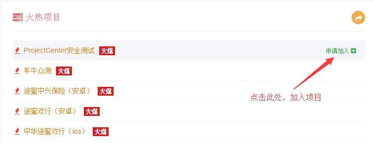 (2)在测试项目页面申请加入项目----点击”申请加入“即可完成加入项目的操作