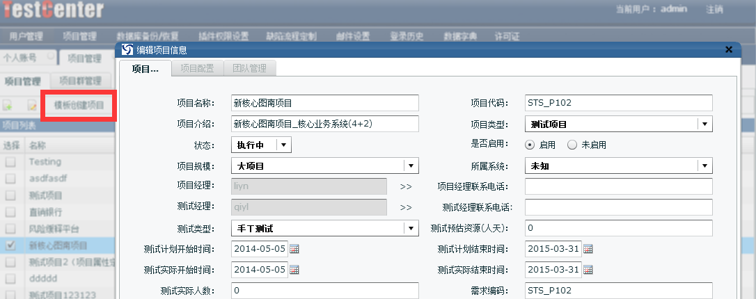 比如我想创建一个项目,和某个项目类似,只需要选中某个项目然后点击<模板创建项目>可以啦,不过其中项目代码、项目名称需要修改哦,不能重复