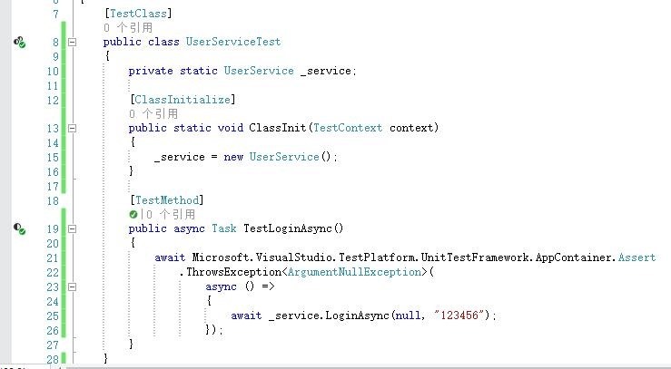 Microsoft.VisualStudio.TestPlatform.UnitTestFramework.AppContainer.Assert。有够长的。。。然后这个类只有 ThrowsException 这个方法(它有三个重载)。三个重载第一个参数都是 Func<Task> 类型,里面可以执行我们需要测试的异步方法了。