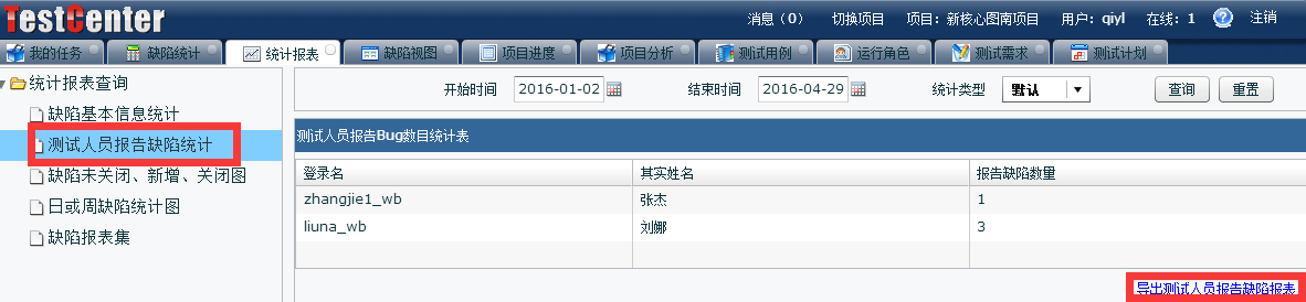 路径:缺陷管理---统计报表---测试人员报告缺陷统计(还可以导出PDF的报表哦)