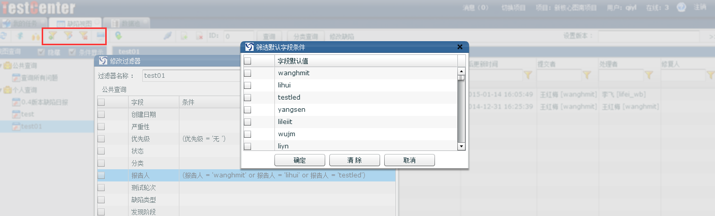 缺陷有那么多属性,可衡量的指标,领导也不会只看数量的,那怎么办,Testcenter一直追求的客户经验,早已设计好了解决方案,是这样的,关于统计缺陷,我们可以自定义一个筛选器,比如领导想要知道在测试项目中小Z一共提交了多少优先级低的缺陷,看图设置一个过滤器,图↓