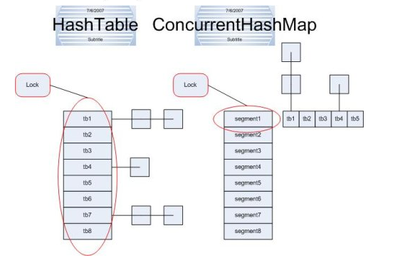 对比上图(该图摘自网络),同步容器HashTable实现锁的方式是锁整个hash表,而并发容器ConcurrentHashMap的实现方式是锁桶(简单理解是将整个hash表想象成一大缸水,现在将这大缸里的水分到了几个水桶里,hashTable每次都锁定这个大缸,而ConcurrentHashMap则每次只锁定其中一个 桶)。