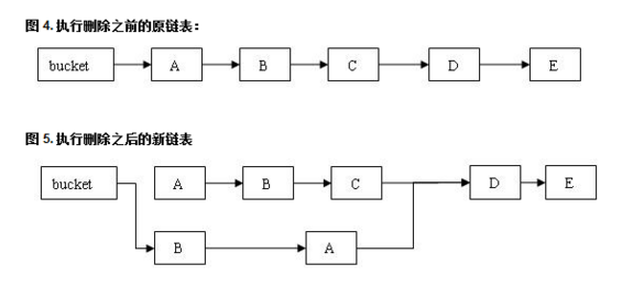 对比上图,当对ConcurrentHashMap的一个segment(也是一个桶中的节点)进行remove后,例如,删除节点C,C节点实际并没有被销毁,而是将C节点前面的反转并拷贝到新的链表中,C节点后面的不需要被克隆。这样的操作使并发的读线程不受并发的写线程的干扰,例如,现在有一个读线程读到了A节点,写线程把C删掉了,但是看上图,读线程仍然可以继续读下去;当然,如果在删除C之前读线程读到的是D,那么更不会有影响。