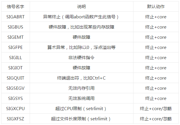 Linux信号有很多,这里我们列举出默认动作中可能产生core文件的信号(摘自《UNIX环境高级编程》第二版)