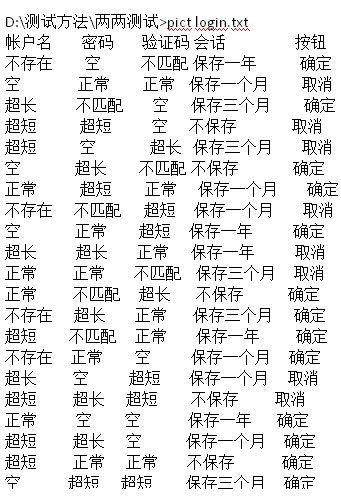 如直接通过PICT执行参数文档,测试用例会打印在屏幕上,如下所示: