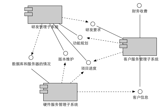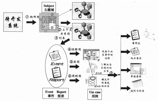 第一阶段,明确目标和范围也是需求的定义阶段,在项目立项初始对需求范围的梳理阶段。这个阶段的核心目标是通过划分主题域(subject)、标示出每个主题域中的业务事件(event)和确定报表(report)的方式明确分析的范围和目标。在上一篇文章我已经完整叙述了整个划分和标示的流程,在这里简单地说一下。笔者提倡一种自上而下、逐层分解的分析思路。 在这个阶段需要按照业务流程来划分,以"事"为线索贯穿系统,用uml中的构件图建模并表达业务流程抽象化的过程。首先应该按照业务的职责区块来划分子系统,然后根据实现关系及使用关系标示出各系统之间的接口并且在这个阶段分析各子主题域之间的关系,后一步进行主题域范围的明确,界定每个主题域内进行的功能以及相关的事件并且要考虑到Customer与Worker之间的关系。找到系统中所有的客户,考虑这些客户会引起什么事件的发生,这些事件会引起Worker什么样的工作,将这些都考虑进来。然后再补充Worker主动发起的动作,那么一个系统的所有事件能没有遗漏地梳理完整了。