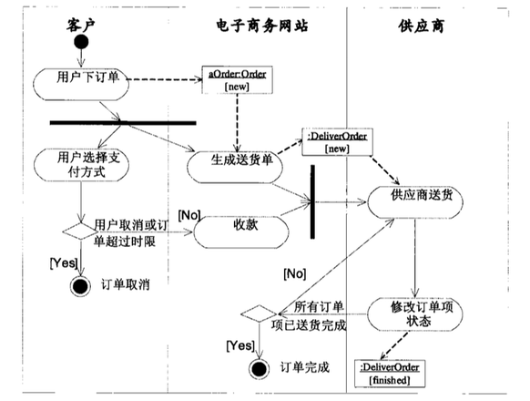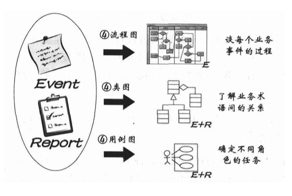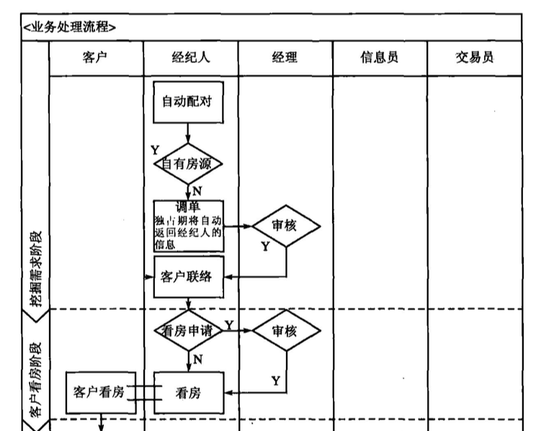 第二阶段,理清脉络阶段是对业务粒度的细化。该阶段的任务是对每个业务事件、每类报表进行人事物三者之间关系的分析,并标示出绝大部分的用例。需求先分解再提炼,第一阶段是需求分解并形成组织架构的阶段,在第二阶段是对需求进行提炼的过程。前面说过分解是一个自上而下的过程,那么按照一种线索进行分解时多个业务时间会产生相互交叠的情况。提炼是一种自底向上的方式将每个业务事件的类进行提炼,抽取出共性的部分,建立针对整个系统的全局领域模型。我们可以使用uml中的领域类图、流程图和用例图来理清需求的结构框架和行为脉络,把业务事件列表以及报表输出成领域模型和用例模型。业务流程的梳理应该是每个产品人的基本功,在这里我推荐使用跨职责流程图以及完善的活动图提炼出业务模型。