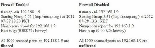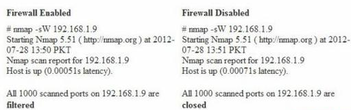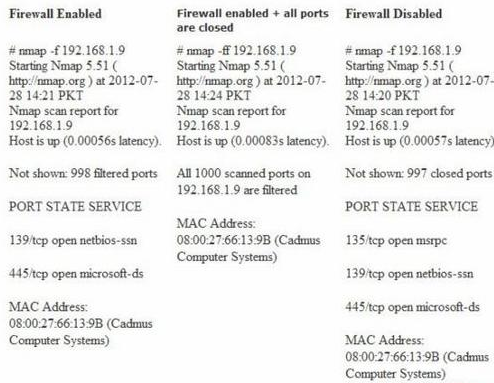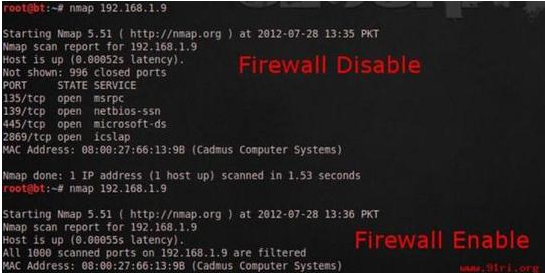 现在可以很容易的发现目标的计算机是否启用了防火墙,因为一个简单的ACK扫描意味着攻击者只有较低的概率检测到受害机,但是有较高的几率发现防火墙。下面我们来看下一个SYN扫描在防火墙开启和未开启的时候,扫描的结果: