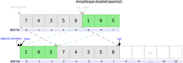 下面再说说扩容函数doubleCapacity(),其逻辑是申请一个更大的数组(原数组的两倍),然后将原数组复制过去。过程如下图所示: