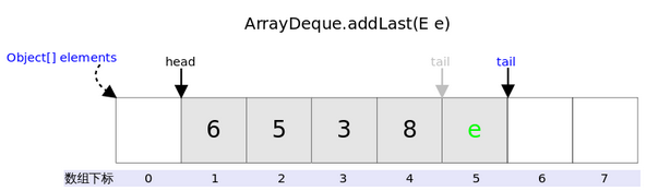addLast(E e)的作用是在Deque的尾端插入元素,也是在tail的位置插入元素,由于tail总是指向下一个可以插入的空位,因此只需要elements[tail] = e;即可。插入完成后再检查空间,如果空间已经用光,则调用doubleCapacity()进行扩容。