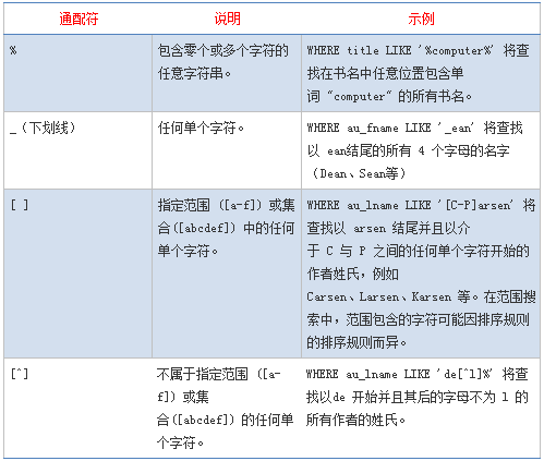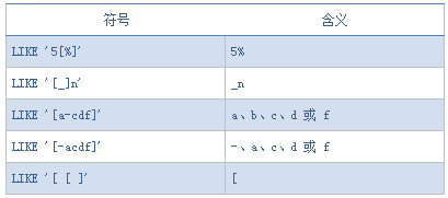 可以将通配符模式匹配字符作为文字字符使用。若要将通配符作为文字字符使用,请将通配符放在方括号中。下表显示了几个使用 LIKE 关键字和 [ ]通配符的示例。