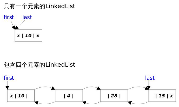 LinkedList底层通过双向链表实现,本节将着重讲解插入和删除元素时双向链表的维护过程,也即是之间解跟List接口相关的函数,而将Queue和Stack以及Deque相关的知识放在下一节讲。双向链表的每个节点用内部类Node表示。LinkedList通过first和last引用分别指向链表的第一个和后一个元素。注意这里没有所谓的哑元,当链表为空的时候first和last都指向null。